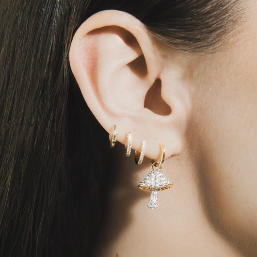 Hoops measure 12mm diameter, Mushrooms 15mm top to bottom and are made from 22ct yellow gold vermeil and lab grown diamonds. All jewellery is available to order in solid gold with diamonds. POA